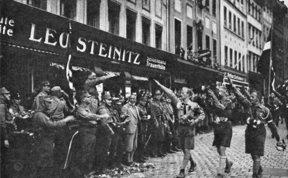 Adolf Hitler with Bavarian party members at a remembrance ceremony for former military forces in Nuremberg
