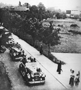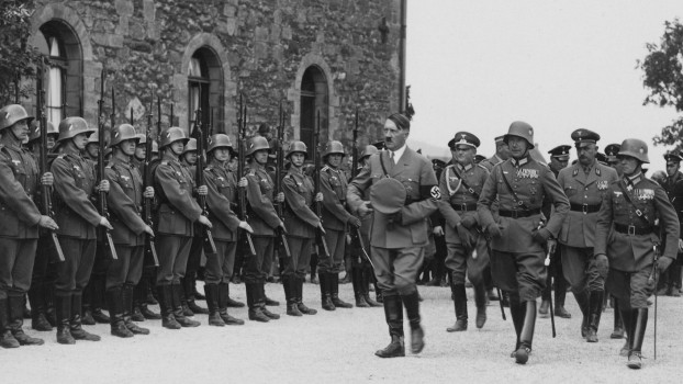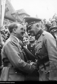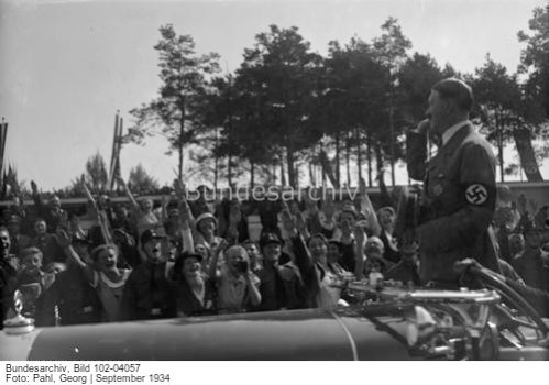 After Paul von Hindenburg's death, a plebiscite was held to approve the merge of the positions of chancellor and Reich president. 89.9% of the population voted yes, giving Hitler dictatorial authority (propaganda poster: Yes! Führer, we follow you!)