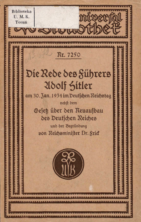 Adolf Hitler makes a speech at the Reichstag where he established the Law for the Reconstruction of the Reich, which de-federalized and transferred all sovereign powers of the Länder to the Reich