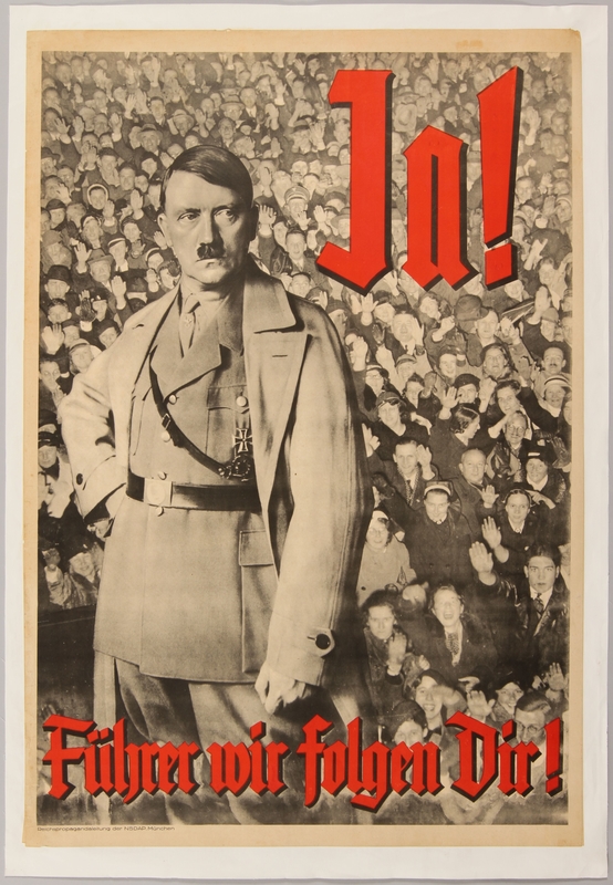 After Paul von Hindenburg's death, a plebiscite was held to approve the merge of the positions of chancellor and Reich president. 89.9% of the population voted yes, giving Hitler dictatorial authority (propaganda poster: Yes! Führer, we follow you!)