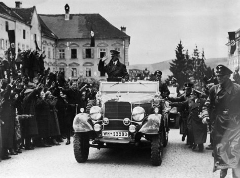Adolf Hitler salutes the parade in front of the town hall in Saarbrücken, to celebrate the reintegration of the Saarland in the German Reich