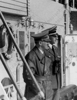 Adolf Hitler and Julius Schaub on the balcony of Hotel Dreesen in Bad Godesberg waiting for the arrival of Neville Chamberlain before their official meeting